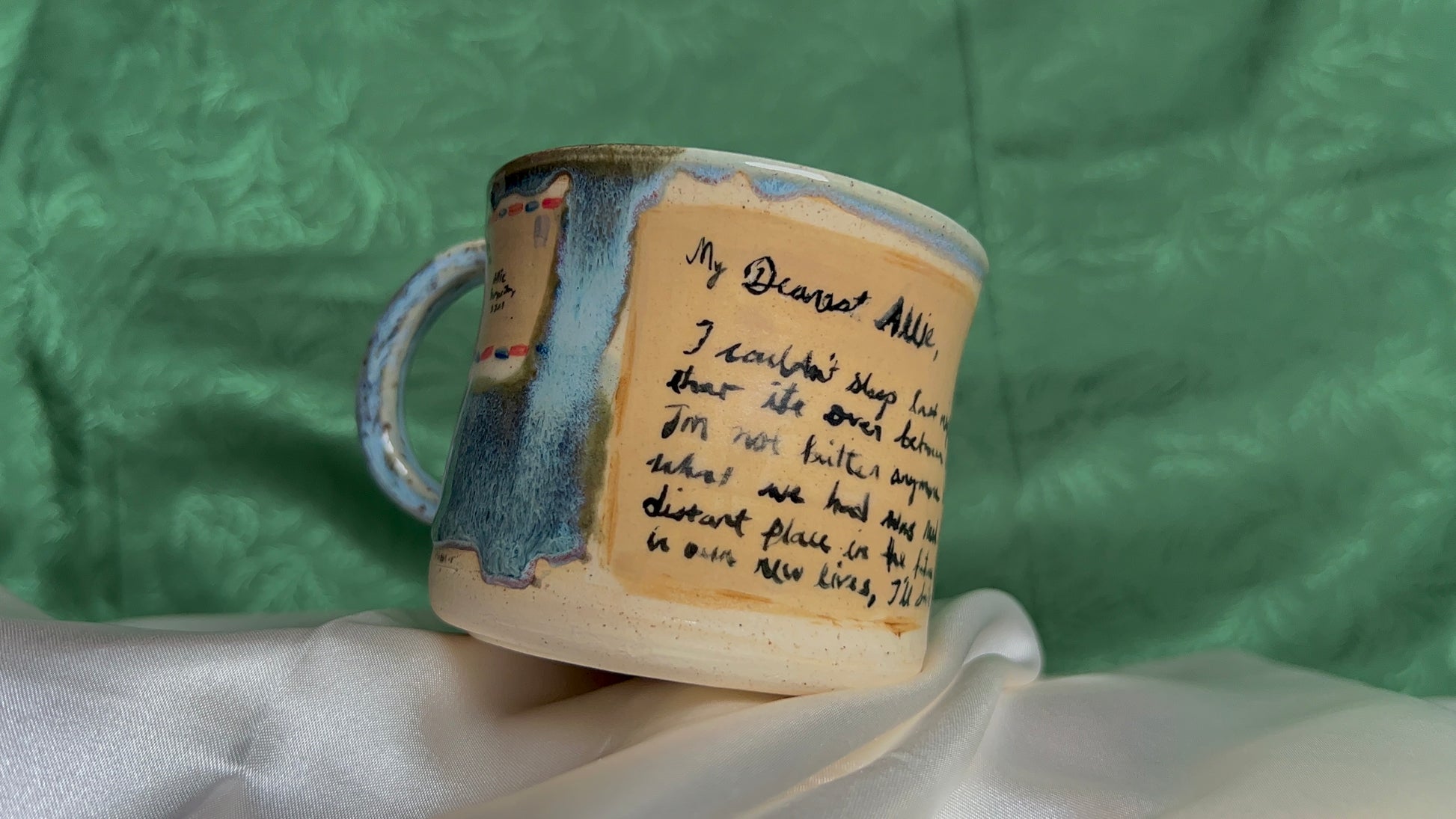 Anything but over. A mug inspired by the classic novel The Notebook, the epitome of hopeful romance. A portion of the first hand-written letter from Noah to Allie.